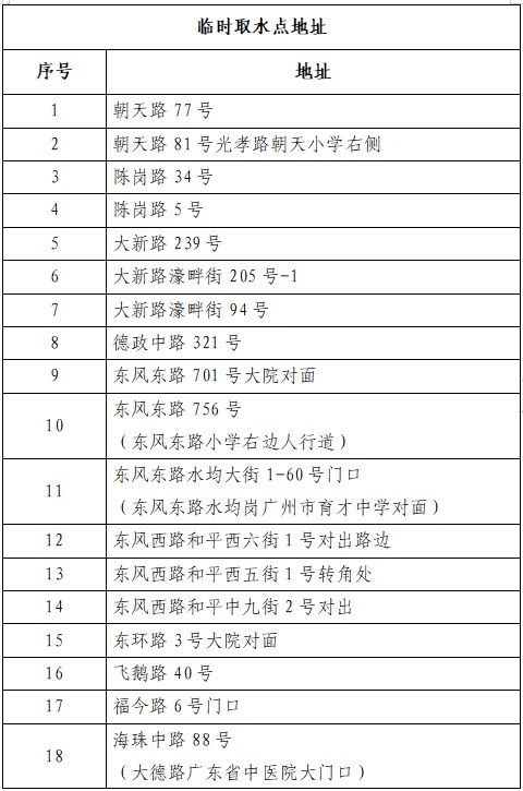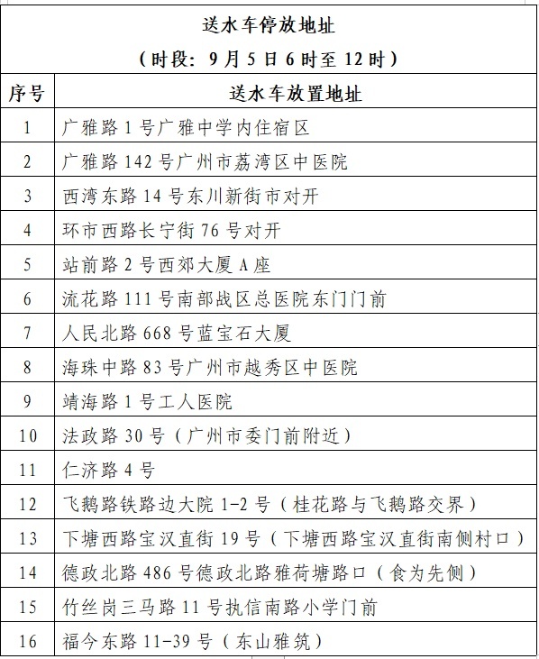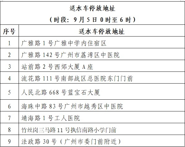 广州市自来水有限公司表示,已通过优化供水调度,将影响降至最低,同时积极采取应急用水保障措施,尽量减少附近居民基本生活用水的影响,9月5日凌晨0时至6时安排9台应急送水车,9月5日白天6时至12时安排16辆应急送水车,设置61个临时取水点在受影响区域提供取水服务。