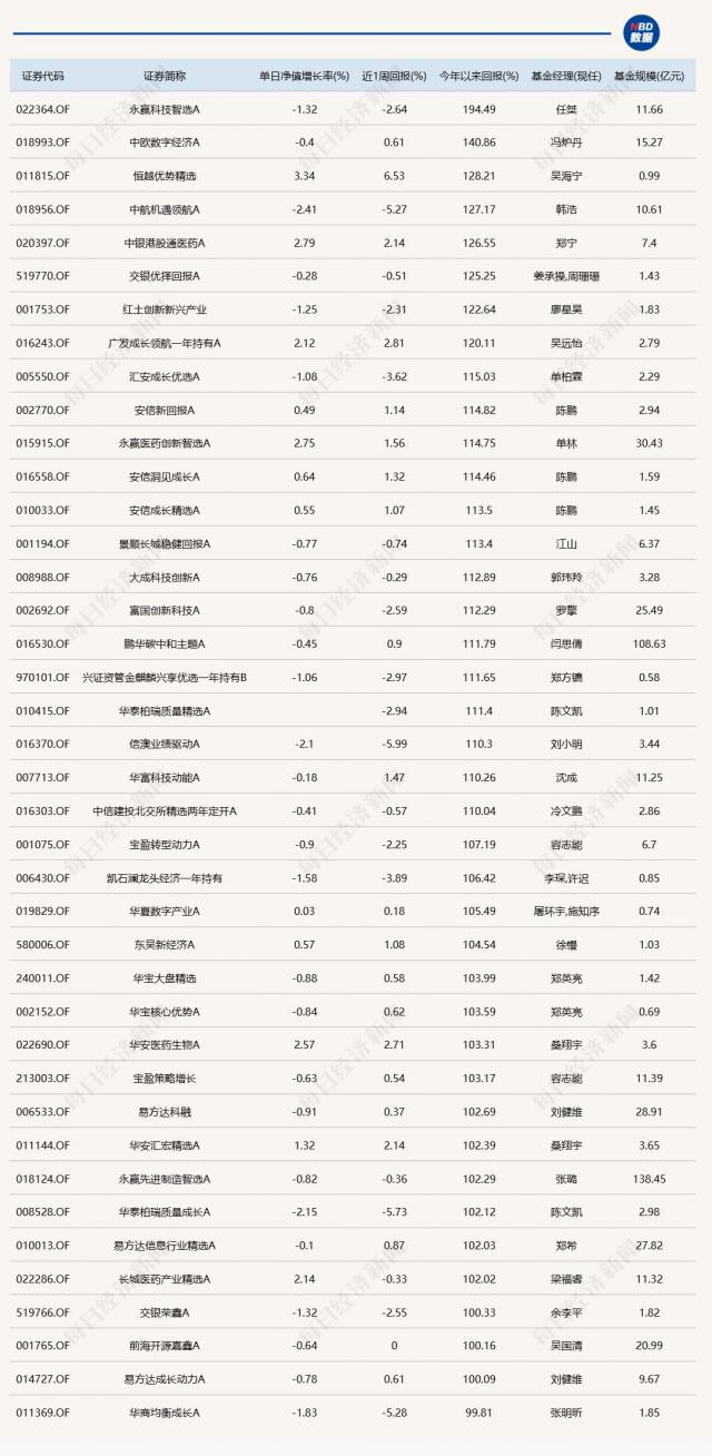 (注:汇添富香港优势精选与上表中排在第 22 名的华泰柏瑞质量精选因有港股持仓,截至发稿净值暂未更新,但不影响年内翻倍的表现)