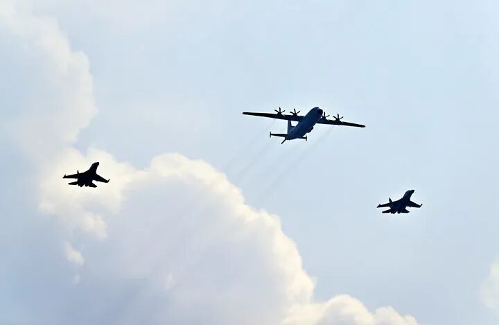 9月3日上午,运油-20A与轰-6N、歼-16、歼-20飞机组成加受油机梯队,以预加油状态飞过天安门广场上空,接受祖国和人民检阅。
