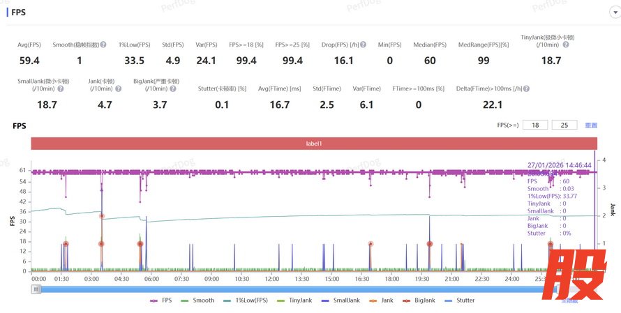 我们使用了《原神》测试了nova 15 Pro的游戏性能,测试时画质设置为高,开启60FPS高帧率模式,进行30分钟跑图测试,用性能狗有线测试模式记录手机实际帧率(关闭充电),实测平均帧率为59.4FPS,1%低帧率为33.5FPS。